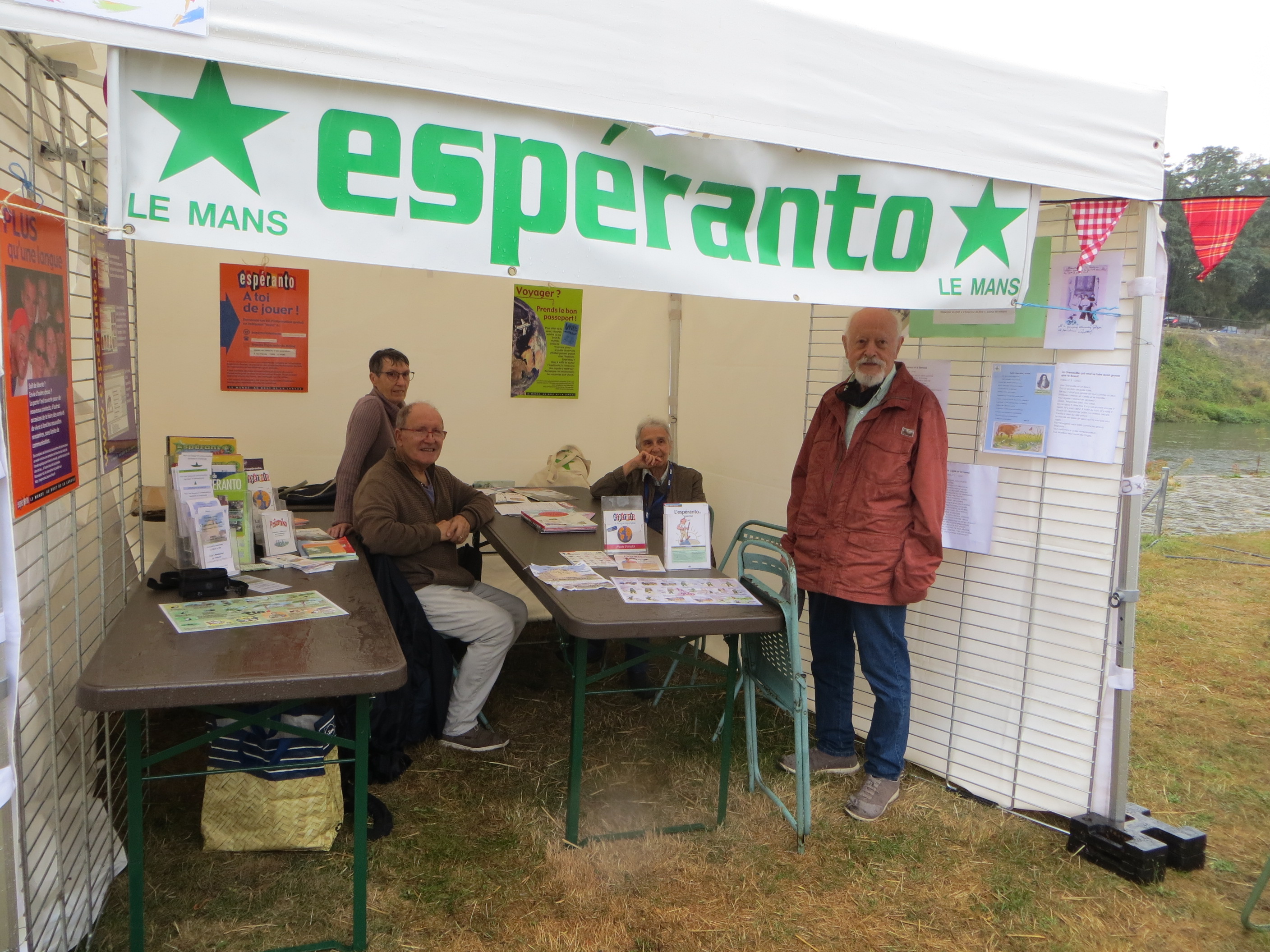 Après l’édition de 2020 placée sous le signe d’un reconfinement proche, celle de 2021 s’annonçait plutôt bien, dans un contexte détendu, moins contraignant, sauf que la météo en a décidé autrement et a vaillamment joué les troubles fêtes. Pourtant, le matin, à l’installation des stands, la journée commençait tranquillement dans une ambiance conviviale. Présentation des documents, affichage des traductions de 3 fables de la Fontaine, information pour la randonnée proposée la semaine suivante, notre groupe Espéranto était prêt pour accueillir le public. À coté du stand Espéranto étaient installées « les Fourmis Sarthoises » association participative de produits locaux. Le décor était parfait…